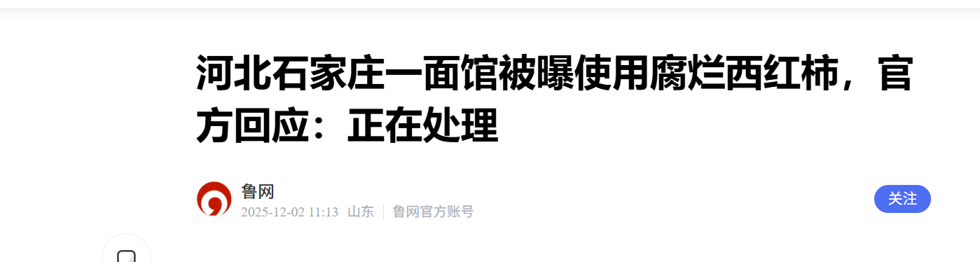 近日,有网民发布视频称,石家庄一家面馆厨师切腐烂的西红柿备餐。对此,12月1日,记者联系该面馆,面馆负责人表示,烂的西红柿已经扔掉,没有给顾客食用。当地市场监督管理部门表示,正在处理此事。